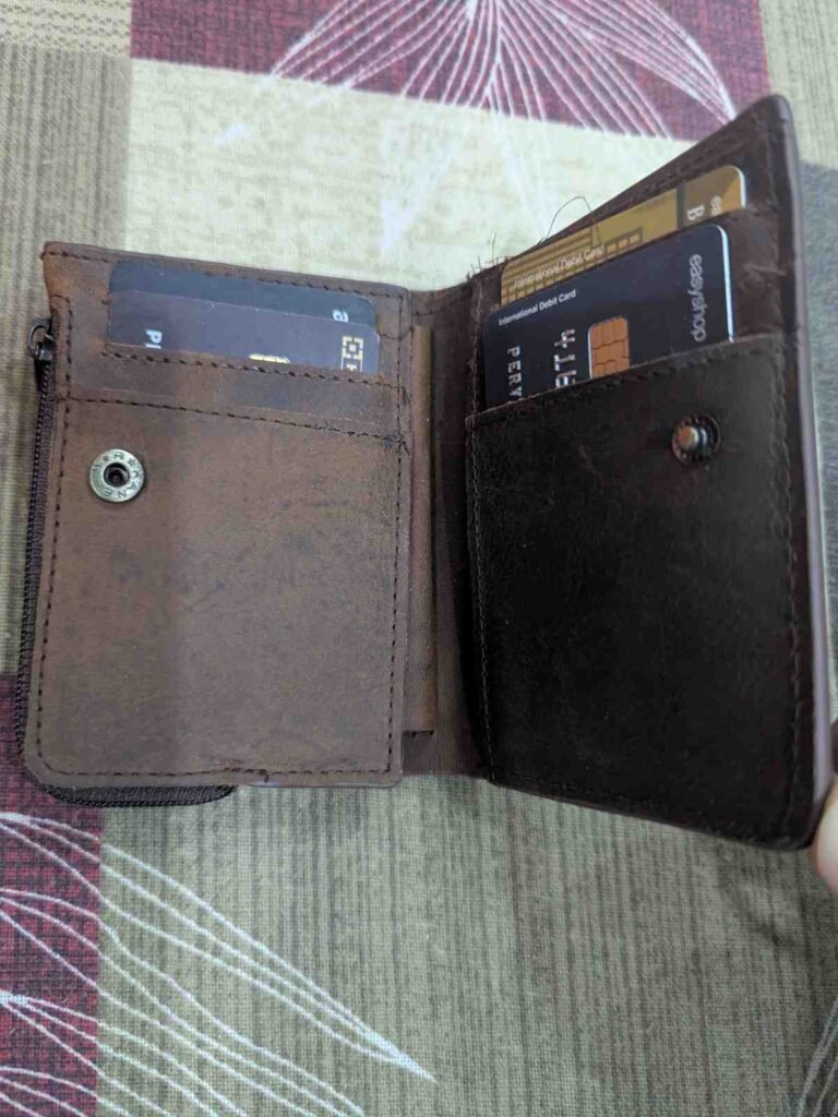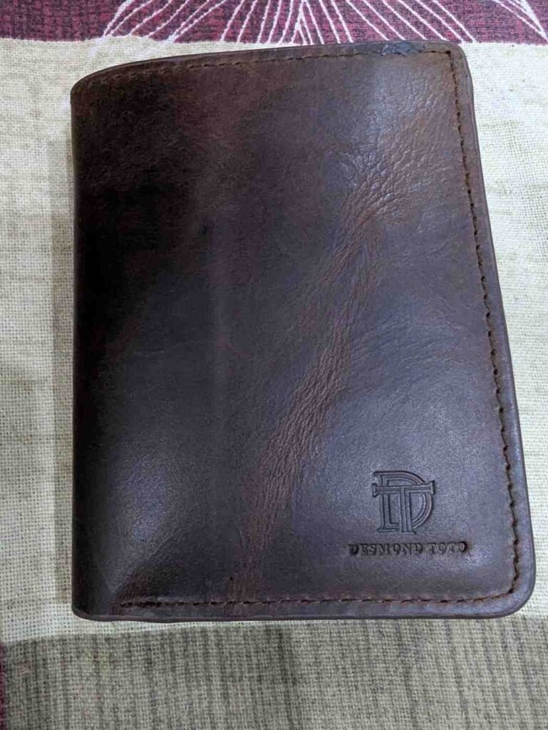 Very good quality leather,thick but soft,nice little shine, very spacious, different design, easily accomodated my cards ,cash ,coins and id, give it a try, highly recommend.