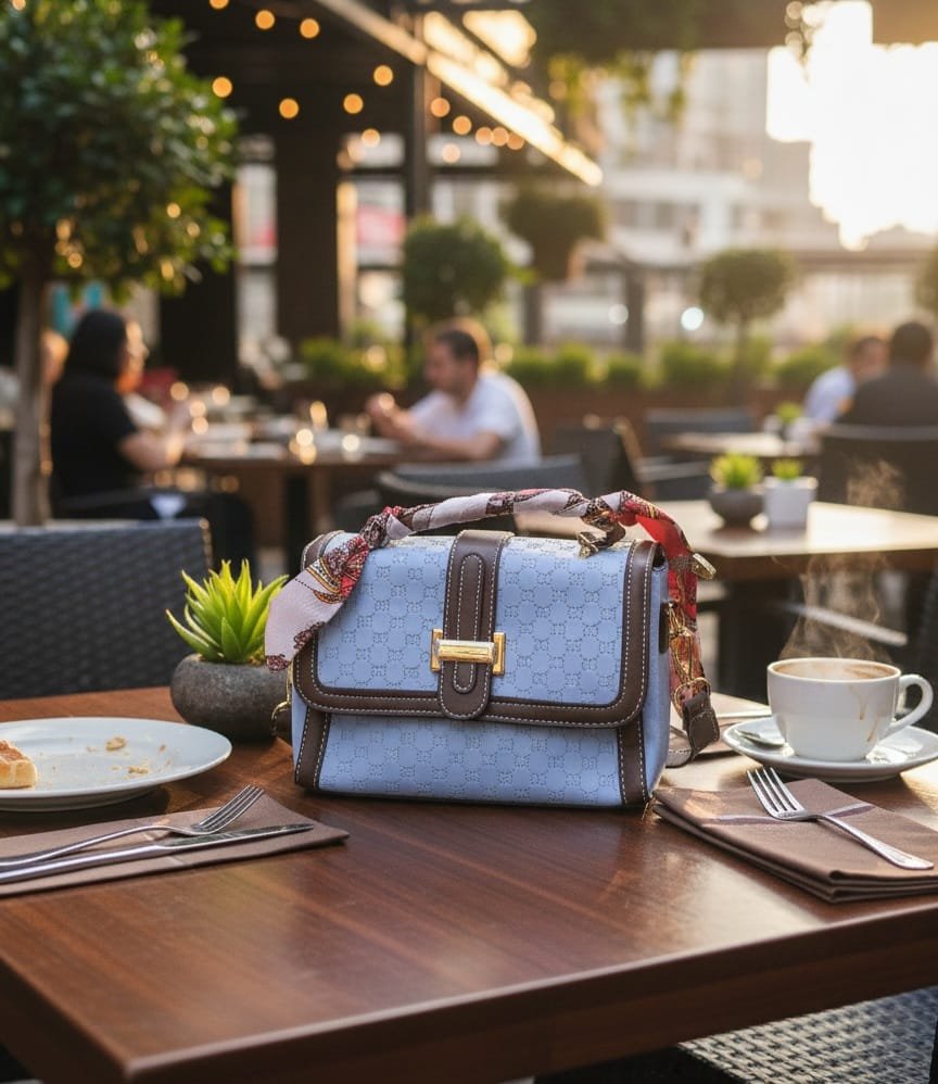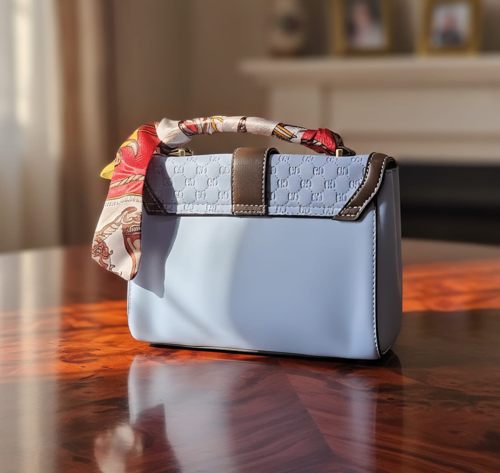 Tags artistic sling bag, Blue, Blue handbag foe women, Blue sling bag, Chic, Crossbody Bag, crossbody sling bag, Designer Flap Bag, Fashion Satchel, handbag, Light Blue and Brown Bag, PARTY USE SLING, Premium Boutique Collection, Scarf Handle Purse, STYLISH SLING, Textured Leather Bag, Women's Luxury Accessories